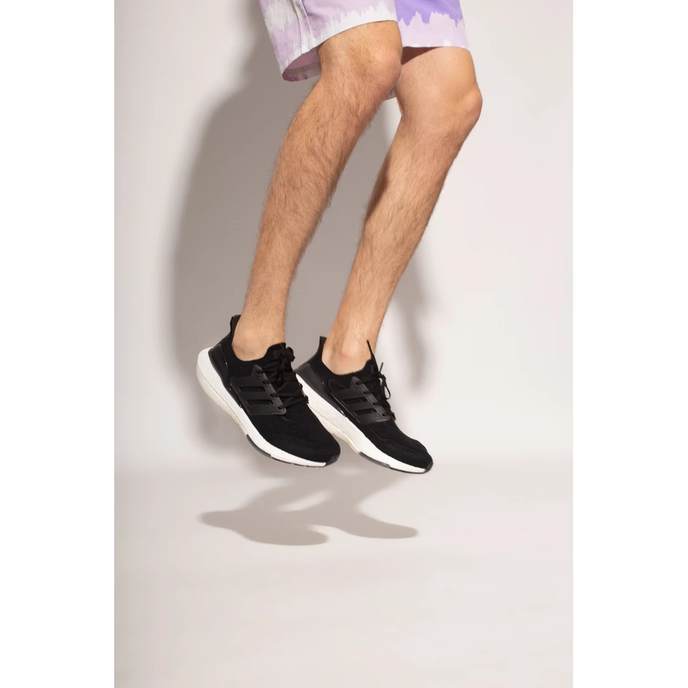Black ‘Ultraboost 21’ joggesko fra Adidas Performance, ‘PrimeBlue’ -linjen. Denne blonderdesignet har en Primeknit+ øvre. Økning i forfotbøyningsstivhet for et mer responsivt løp. PrimeBlue er et ytelsesstoff laget med Parley Ocean Plastic, som er skapt av resirkulert plastavfall som er avverget fra strender og kystsamfunn før det når havene. Produkter laget av primeblue inneholder minimum 40% resirkulert materiale totalt.