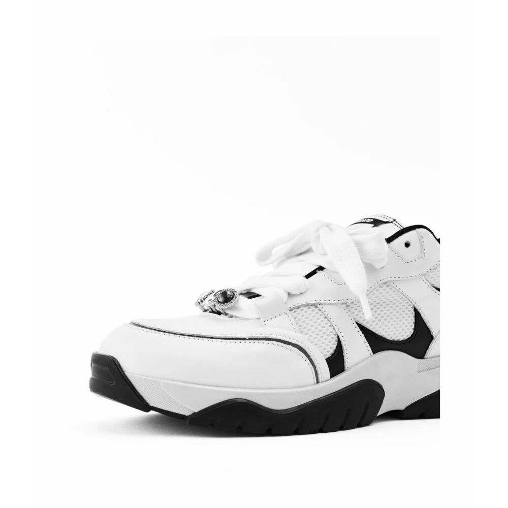 Catfish Sneaker er inspirert av skøytesko som var populære på slutten av 90 -tallet. Dette paret har vært håndlaget i Portugal fra paneler av skinn og netting, og er satt på tykke tilpassede termoplastiske gummisåler. Snørene er aksentert med avtagbare krystallpynt.Denne beskrivelsen er automatisk oversatt.