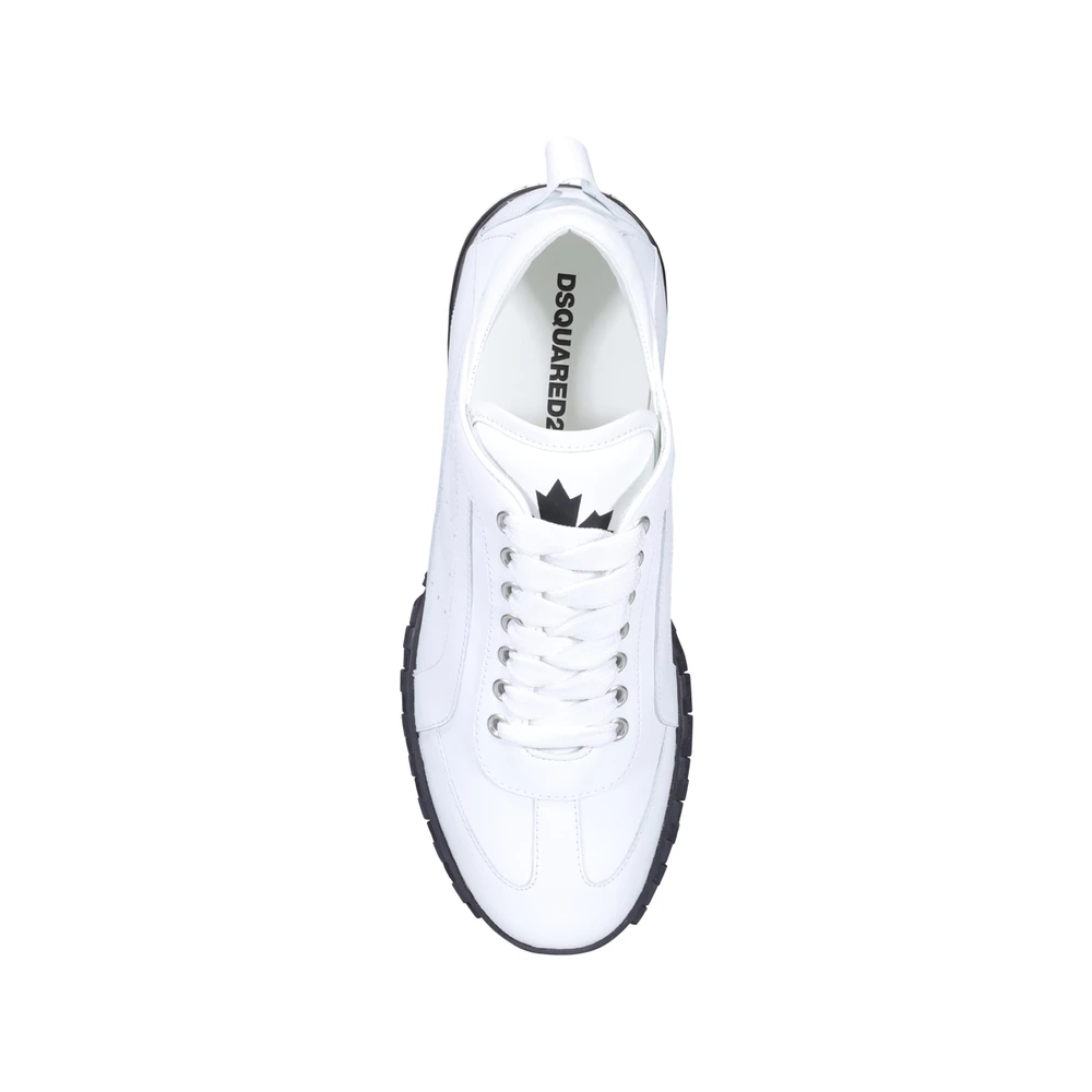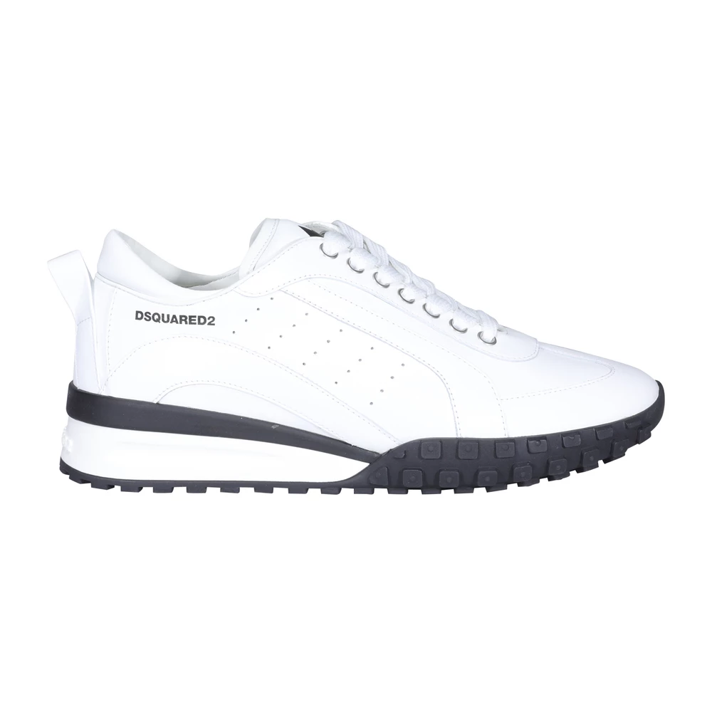 Hvite Dsquared2 Legend lave sneakers laget av skinn. Sort logobokstav på sidene og 3D-logo på hælen. Maple leaf logo på tungen. Trekk i hælklaffen. Snøre opp. Svart og hvit gummisåle. Perforerte sider. Rund tå.
