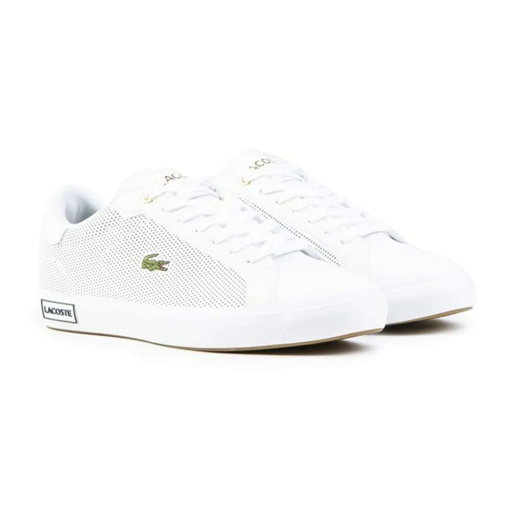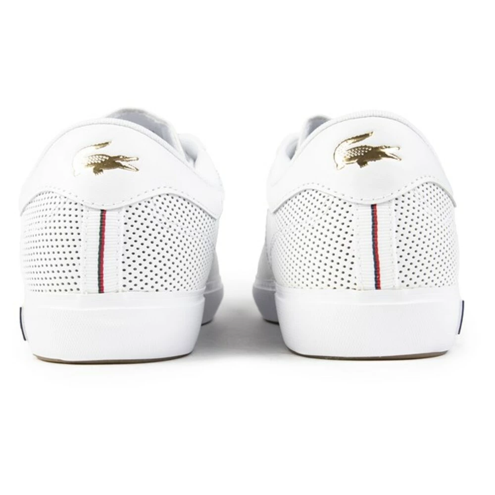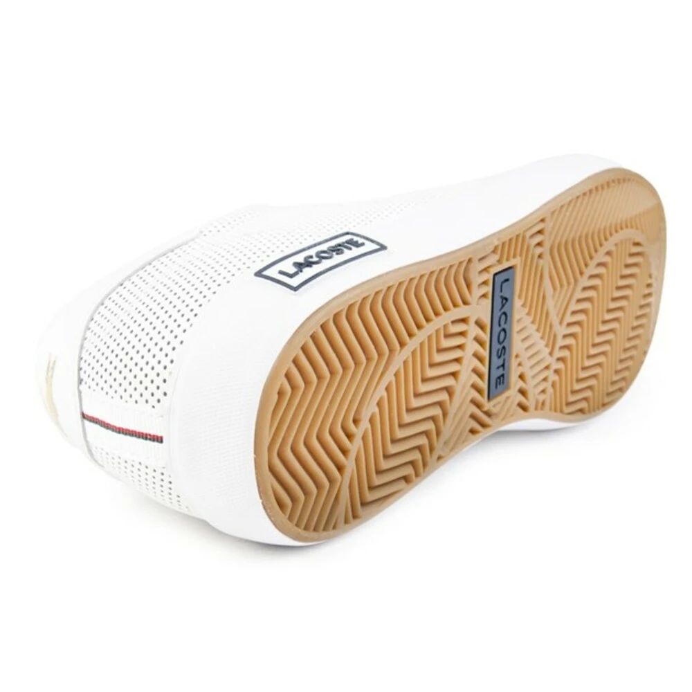 Mens White Lacoste Court perforerte trenere, produsert med skinn og en gummisåle. Med: Court Style, Stitch Croc -merkevarebygging, myke læroverdeler, ortolittinnersåle og perforert detalj.