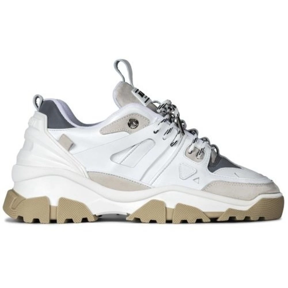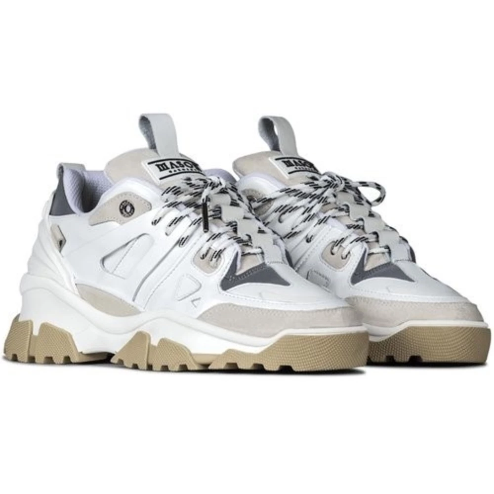 Mason Garments Genova Sneakers White FW22 – Due Colori 19E Produktbeskrivelse Disse Genova -joggeskoene fra merkevaren Mason Garments er nå tilgjengelige hos oss. Disse skoene er laget av skinn og har et stykke semsket skinn på baksiden og fronten. Ryggen har et stykke beige og foran kommer beige tilbake. Tungen på skoen er beige og blonderringene er også grå. Produktsammensetning Materiale: 100% skinn