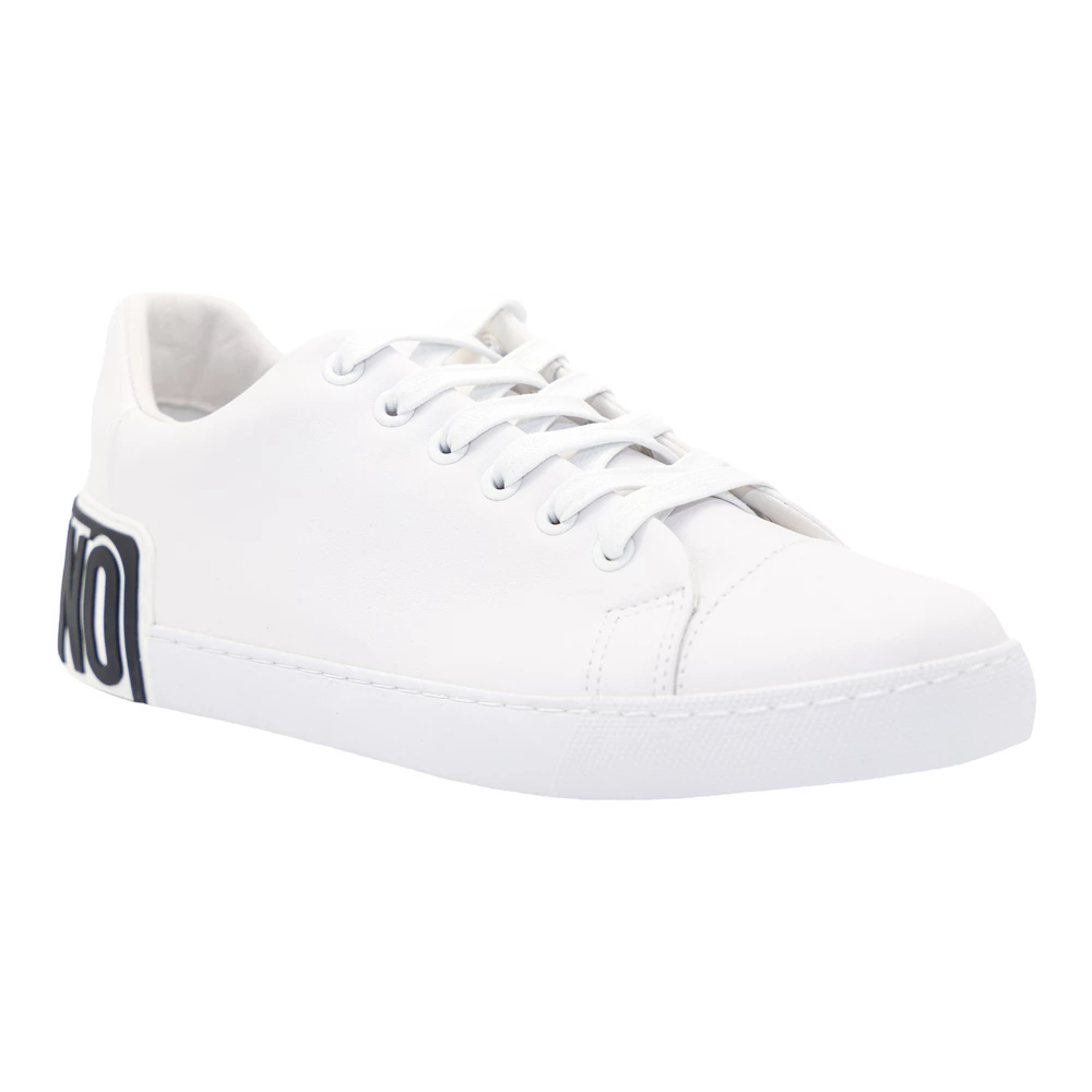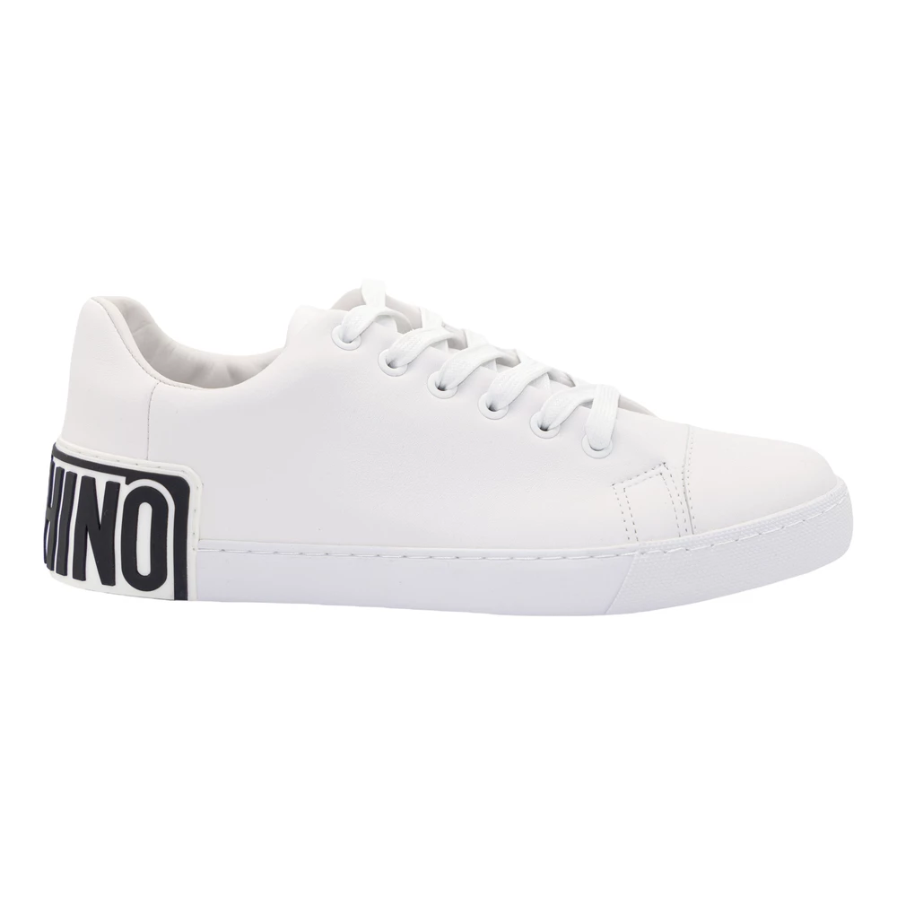Hvite joggesko fra Moschino. Denne snøremodellen er laget av skinn, og sitter på en hvit gummisåle og har en svart og hvit gummilogo-lapp på baksiden.
