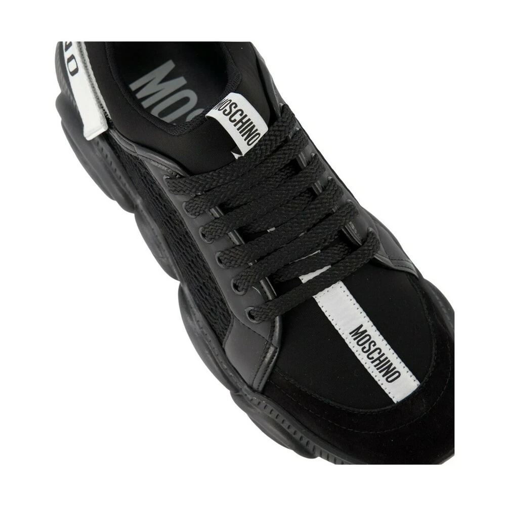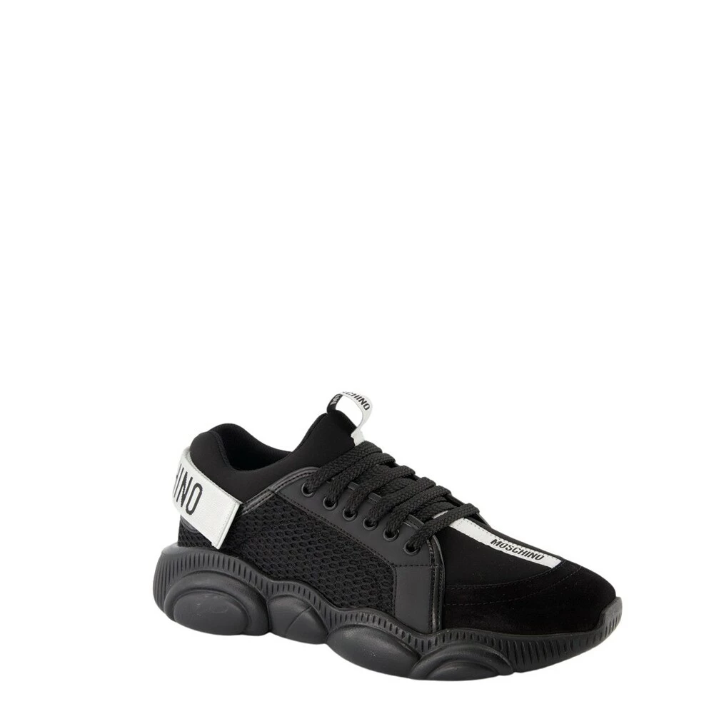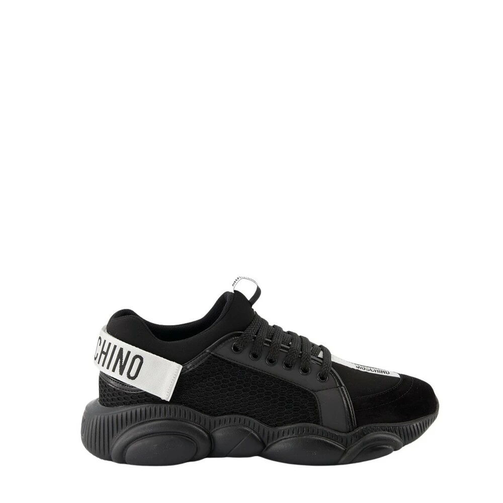Svart og hvite joggesko fra Moschino. Denne snÞremodellen er designet med en panelkonstruksjon, og sitter pÄ en svart gummisÄle i form av merkets signatur bamse og har en logo-lapp pÄ fronten og en logo-embroidered borrelÄs stropp pÄ baksiden.