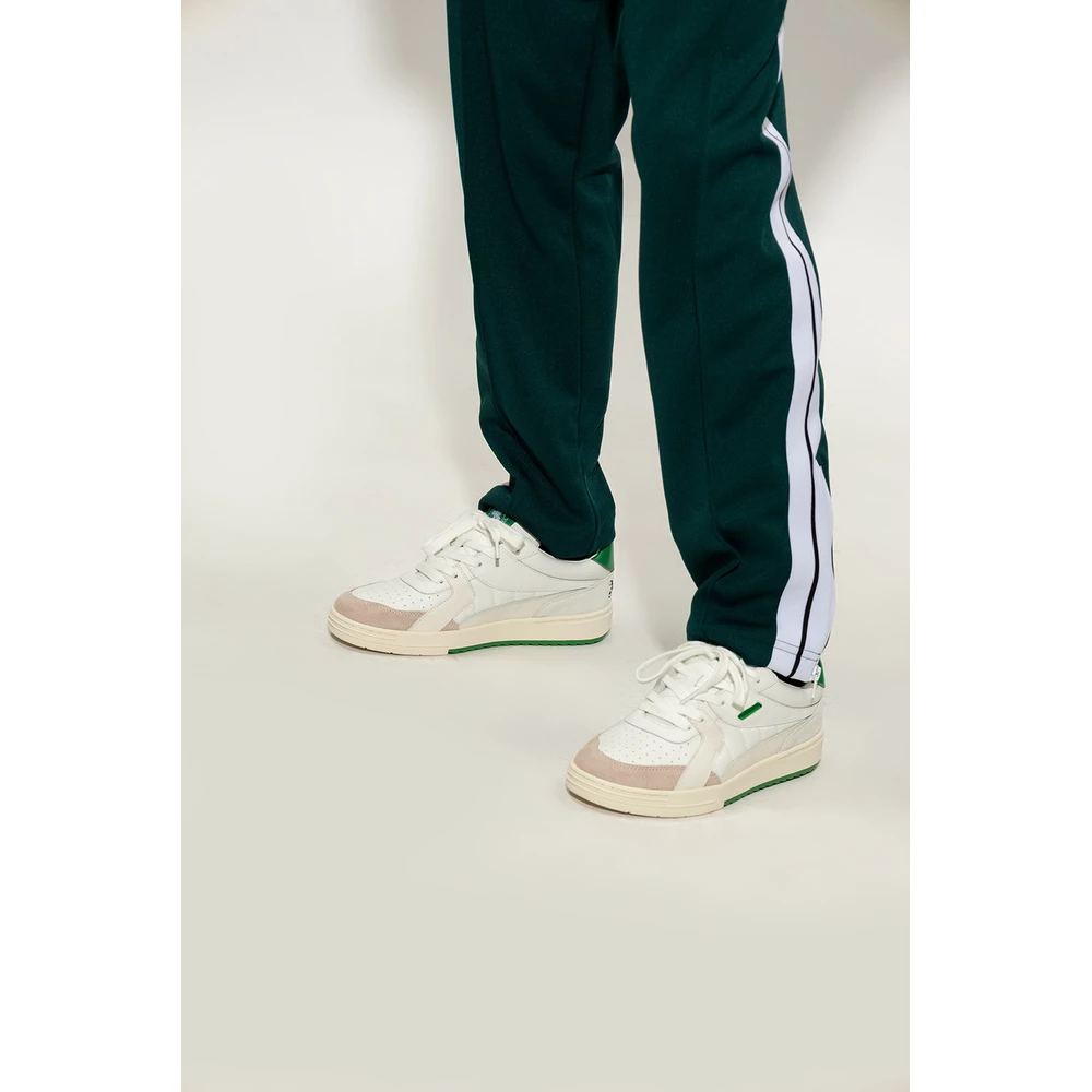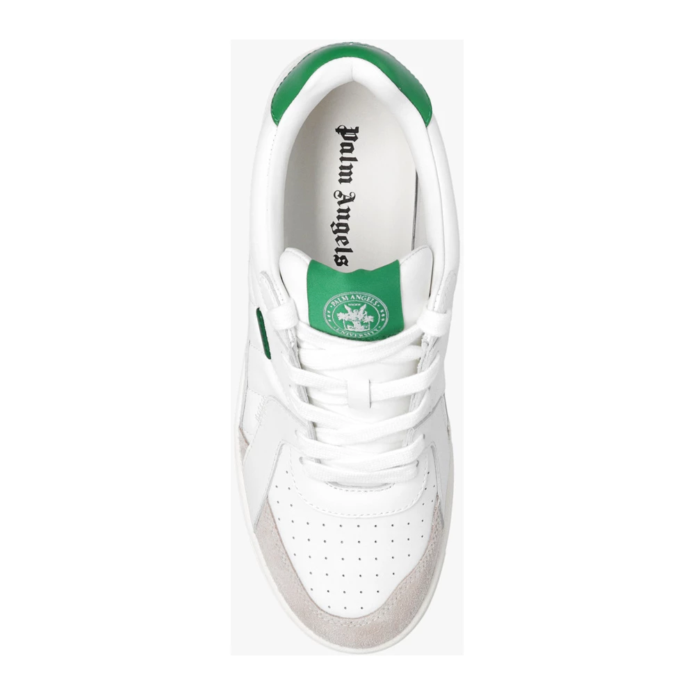 Hvite, krem og grønne joggesko fra Palm Angels. Dette blonderparet er laget av lær og semsket skinn og har en svart og hvit logo, perforeringer, applikasjon på siden og gummisåle i krem og grønt.