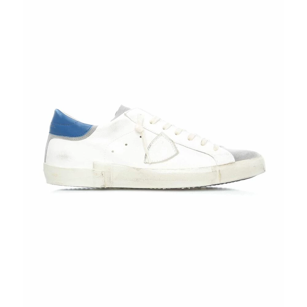Hvite og grå ‘PRSX’ joggesko fra Philippe -modellen. Dette blonderparet er laget av skinn med semsket skinn, og har en vintage-effekt, sølvfarget logo-trykk, logo-broderi, mørkeblå hælbenk og gummisåle i svart og hvitt.