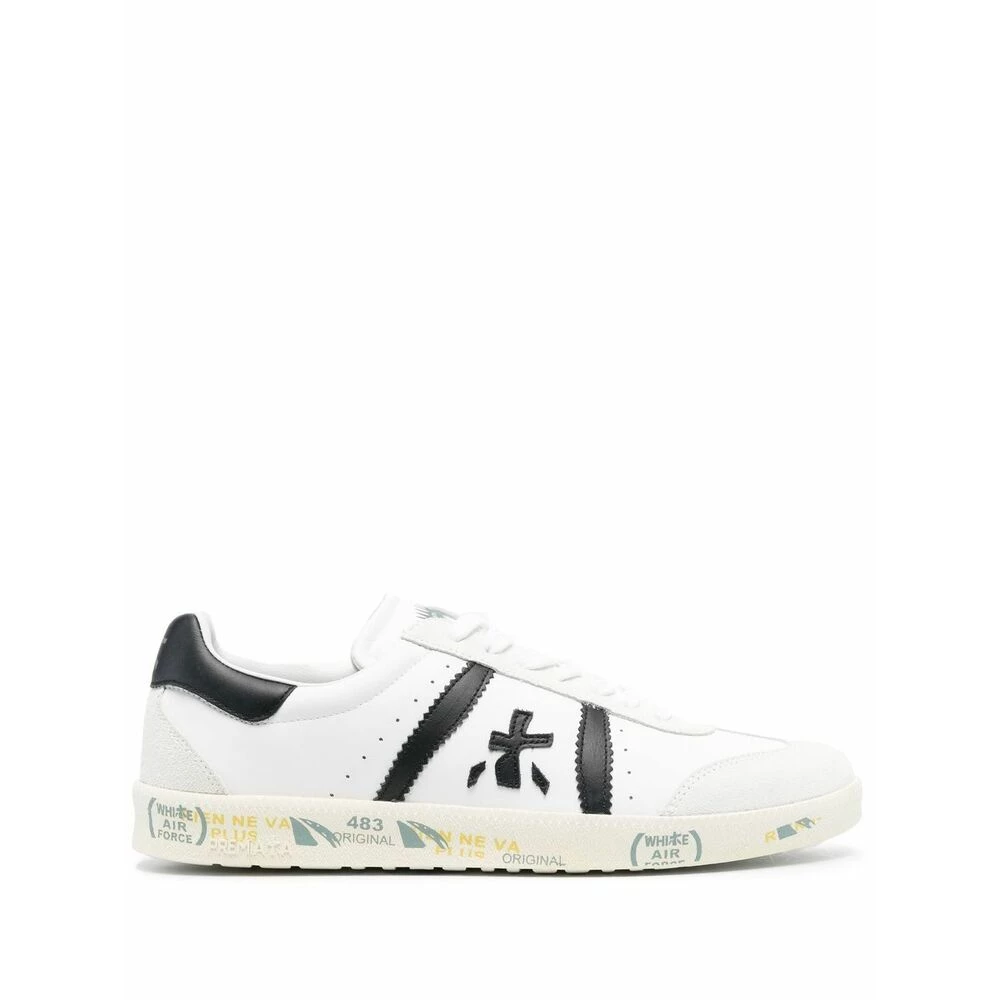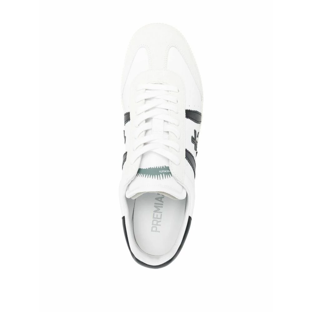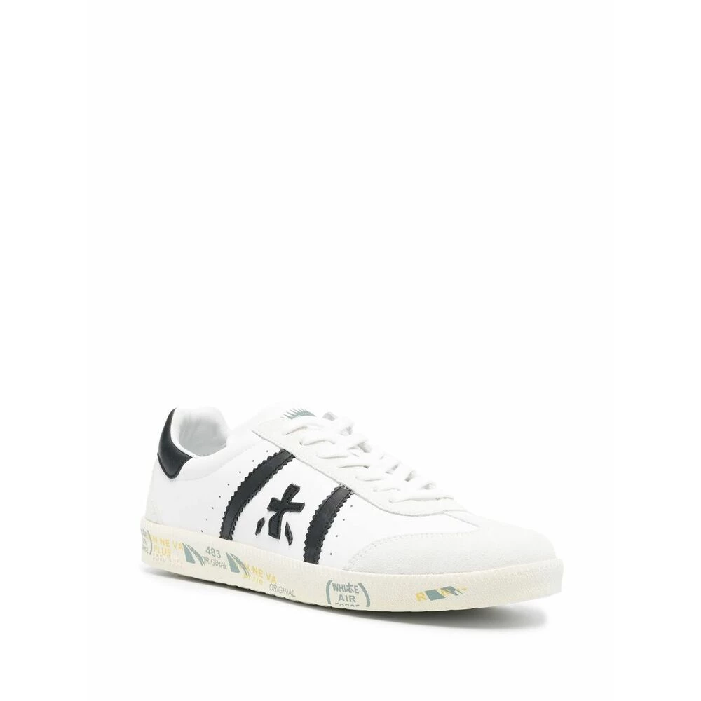 Premiata joggesko hvite bonnie low-top joggesko fra premiata med off-white, svart, kalveskinn, logo lapp til siden, logo-trykk tunge, rund tå, blonder foran festing, merkevaresåle og flat gummisåle.