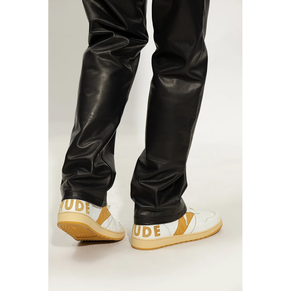 Hvite og mørke gule ‘RECENSE LOW’ joggesko fra Rhude. Dette blonderparet er laget av skinn, og har en tunge lapp med en logo, perforeringer, logo-lapper bak, vintage effekt og gummisåle i mørk gul og krem.
