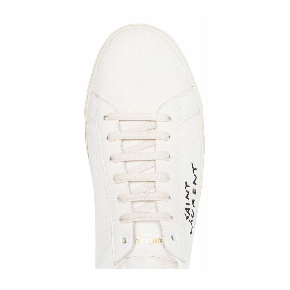 Kremhvite Court Clic sneakers fra Saint Laurent. Laget av bomullsduk og skinn. Merkenavnsbroderi i kontrastfarge. Flat gummisåle. Vintage effekt.