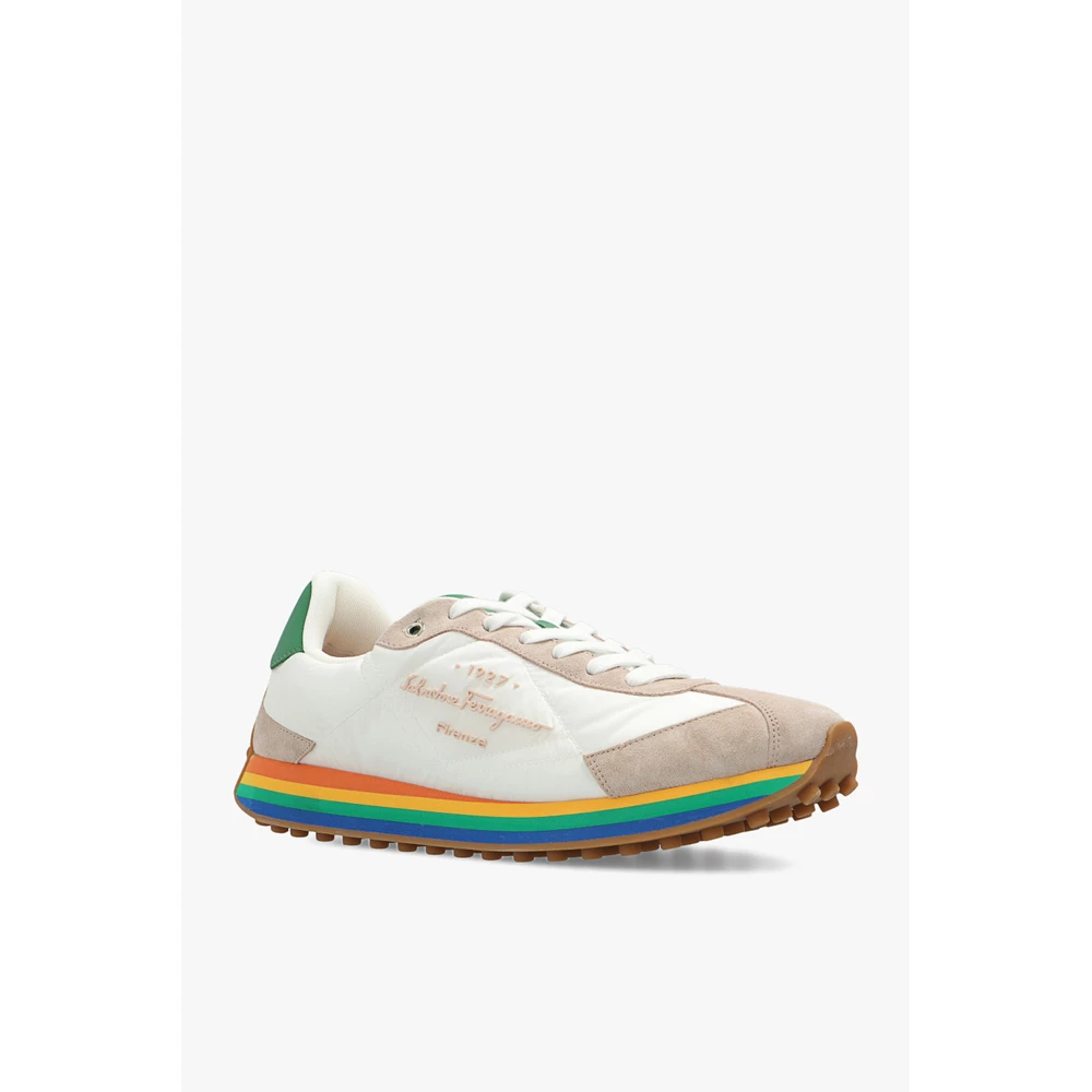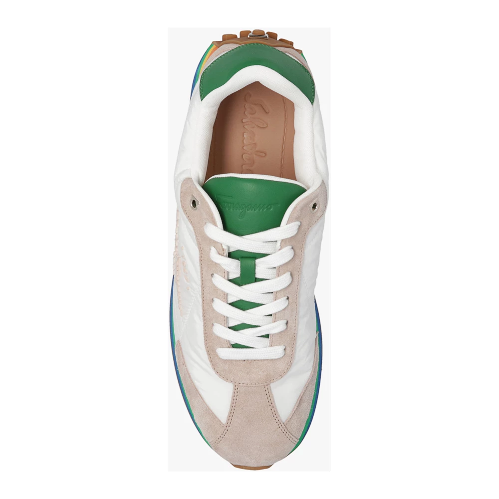 Hvit, krem og grønt ‘Iggy’ joggesko fra Salvatore Ferragamo. Denne blondermodellen er laget av stoff og skinn, og sitter på en beige gummisåle og viser frem en logo-applikasjon.