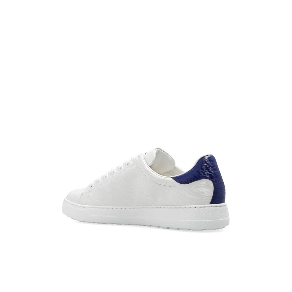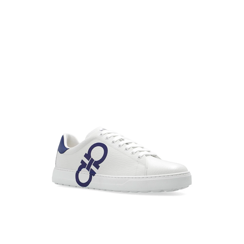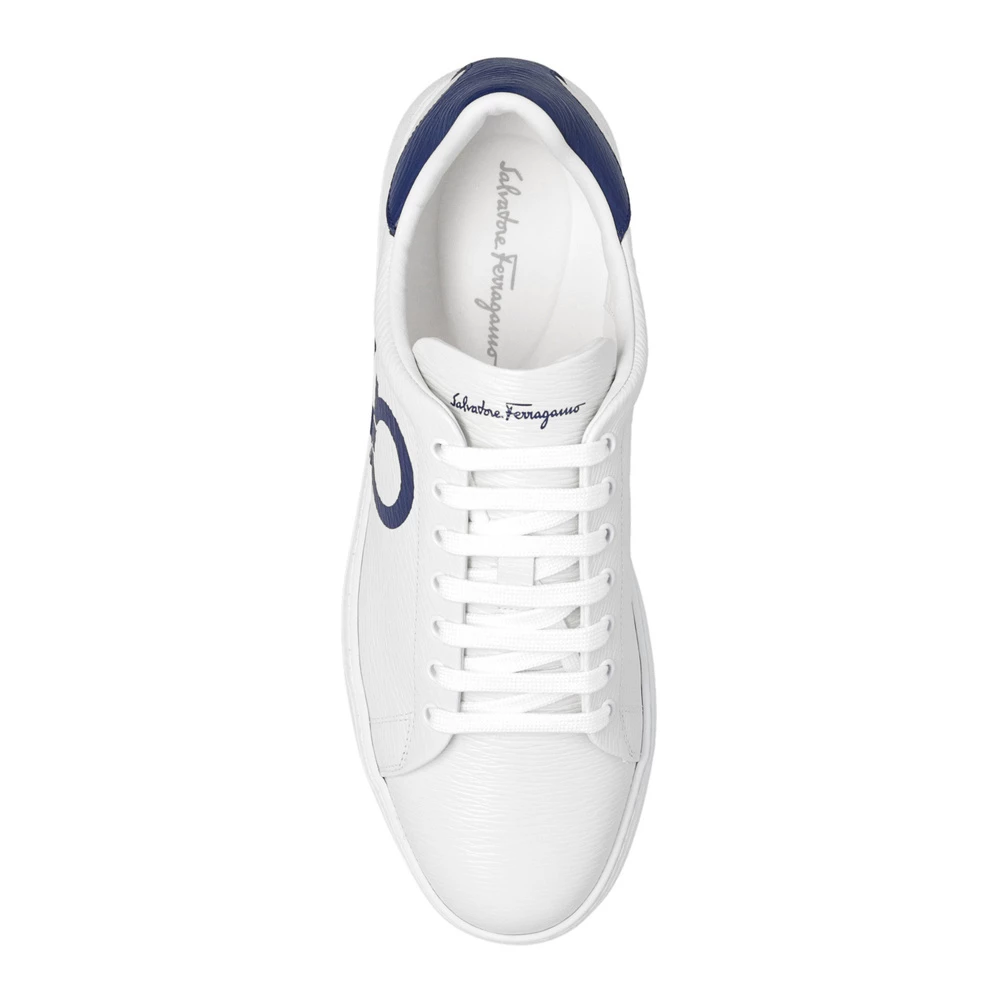 Hvite og marineblå ‘nummer’ joggesko fra Salvatore Ferragamo. Denne snøremodellen er laget av strukturert kalveskinn, og sitter på en hvit gummisåle og viser frem en trykt logo og merkets signatur Gancini-motiv.