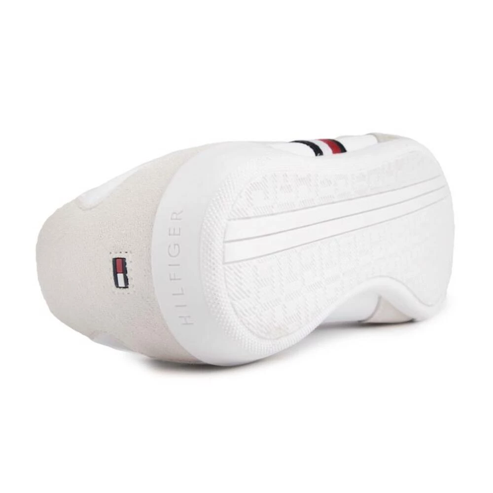 Mens White Tommy Hilfiger Core Corporate Leather Trainers, produsert med skinn og en gummisÄle. Med: Vevd sidemerking, trykt innsokk, gravert topp eyelet, merkevarebygging til tunge og korportat sÄle stripe.