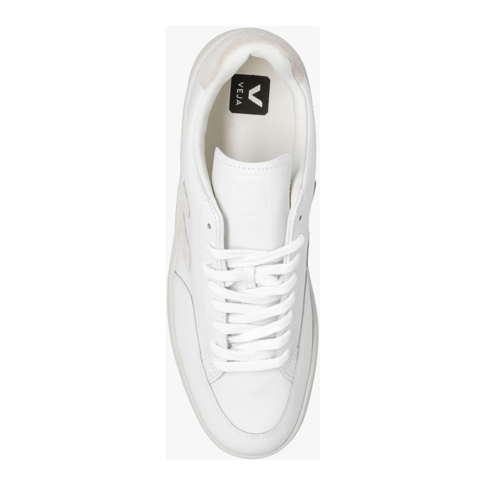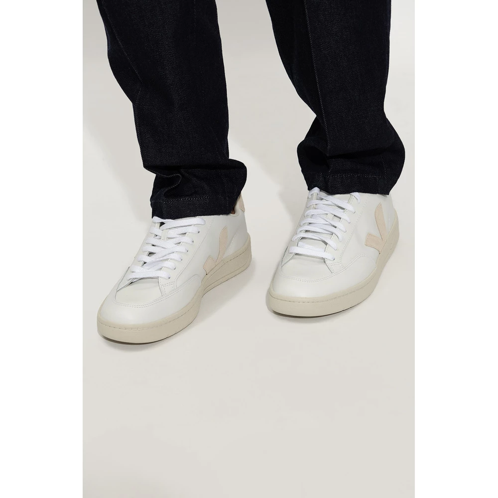 Hvite ‘V-12 skinn’ joggesko fra Veja. Dette blonderparet er laget av et skinn, og sitter på en krem gummisåle laget av organiske og resirkulerte materialer og er beriket av en preget logo på tungen, krem semsket hælbenk med en hvit logo-trykk og organisk bomullslis. Nettingens indre fôr laget av resirkulerte materialer ble utviklet for å få bedre motstand mot friksjon. Den organiske hentet og resirkulerte innersålen er laget av sukkerrør, Amazon-gummi, organisk bomull og resirkulert EVA-skum.