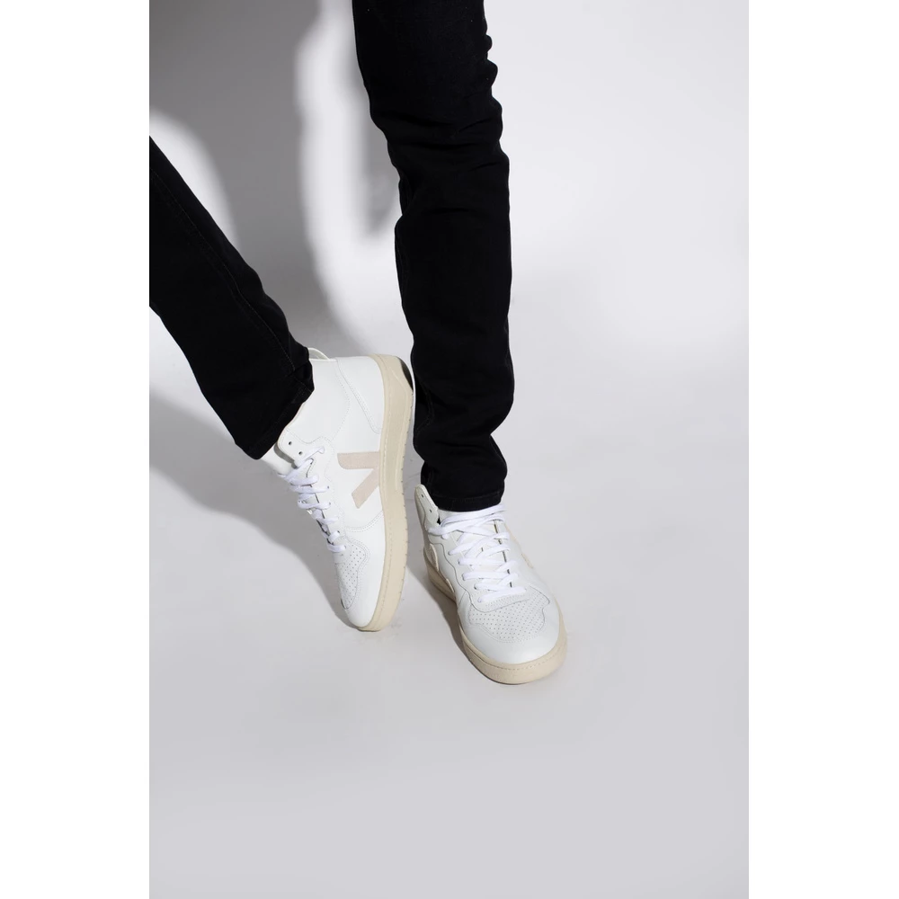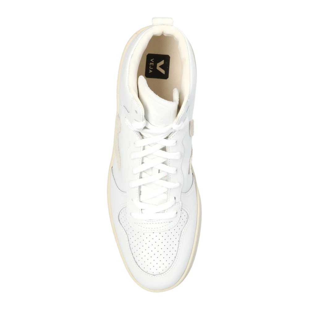Hvite V-15 High-top sneakers med snøre i lær fra Veja. Dette snøreparet er laget av lær og sitter på en kremgummisåle laget av organiske og resirkulerte materialer og er beriket med en logo preget på pløsen, perforeringer, organiske bomullslisser og en beige logolapp laget av semsket skinn. Mesh-innerfôret laget av resirkulerte materialer ble utviklet for å oppnå bedre motstand mot friksjon. Den organiske og resirkulerte innersålen er laget av sukkerrør, Amazon-gummi, organisk bomull og resirkulert EVA-skum. Læret kommer fra gårder i Rio Grande do Sul og er LWG Gold-sertifisert av Leather Working Group, som fremmer bærekraftig praksis som har en positiv innvirkning på miljøet i garverier. Materiale: Overdel: Lær Såle: Sukkerrør, Amazon-gummi, Resirkulert EVA-skum Produktstil-ID: VQ021270B
