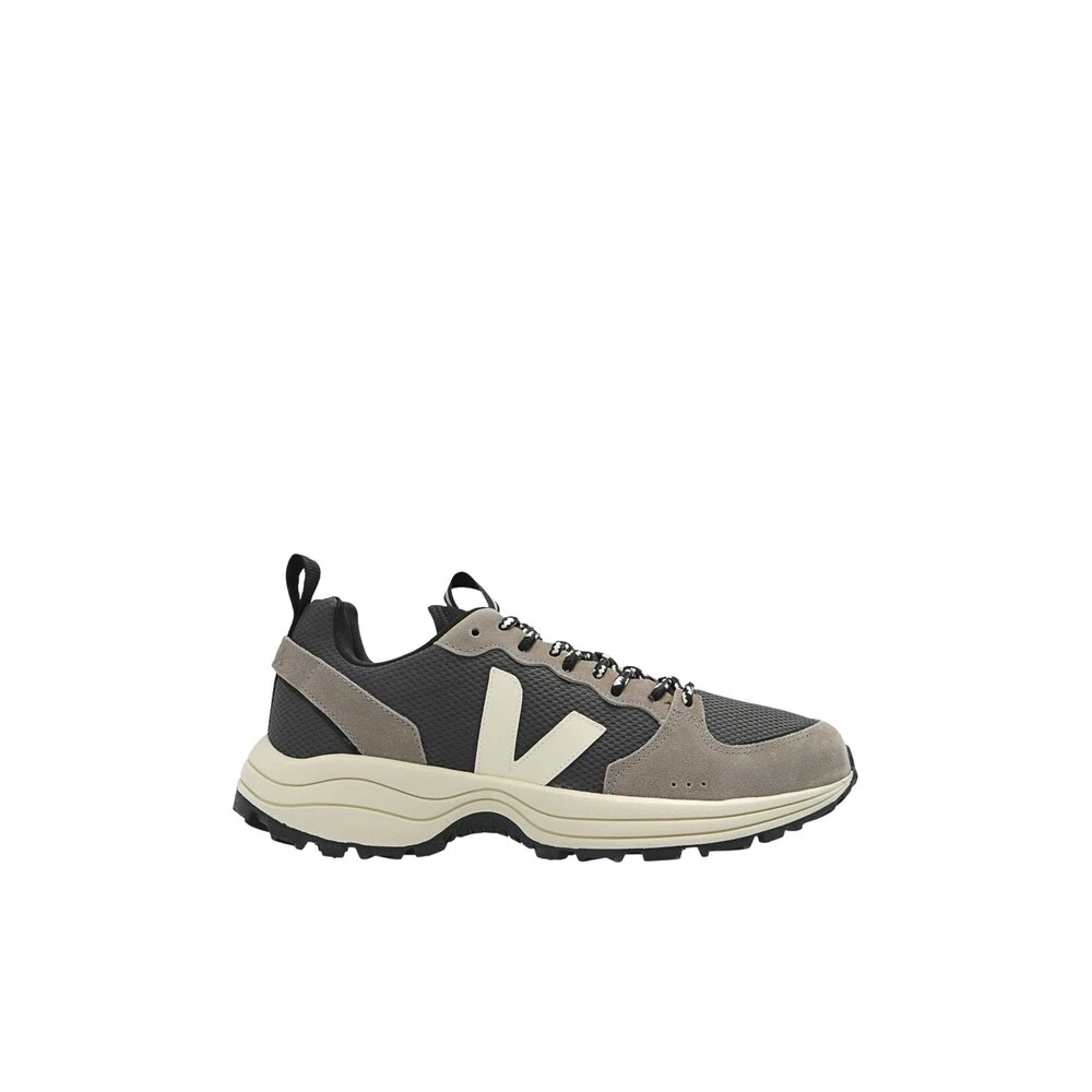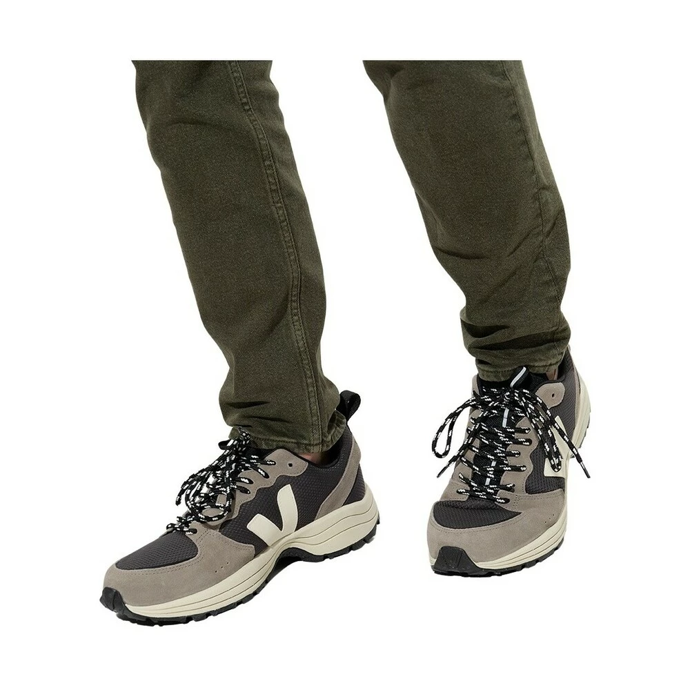 Grå og svart ‘Venturi’ joggesko fra Veja. Laget fra Alveomesh, et holdbart materiale avledet i 100% fra resirkulerte flasker. Dette blonderparet er trimmet med semsket skinn, og har reflekterende detaljer, etikettens signaturkremlogo-lapp produsert av gummi og risavfall. Den organiske hentet og resirkulerte innersålen består av vill gummi, sukkerrør, Amazon, organisk bomull og resirkulert EVA. Mellomsåle er laget av sukkerrør (53%), mens den limte yttersålen – fra Amazon -gummi (12%) og risavfall (30%) med en perforert overflate for økt trekkraft og demping. Den er satt på en svart og krem gummisåle laget av organiske og resirkulerte materialer. Det fleksible nettfôret laget fra 100% resirkulerte plastflasker er utviklet for å få bedre motstand mot friksjon og sikre komfort med hvert trinn.