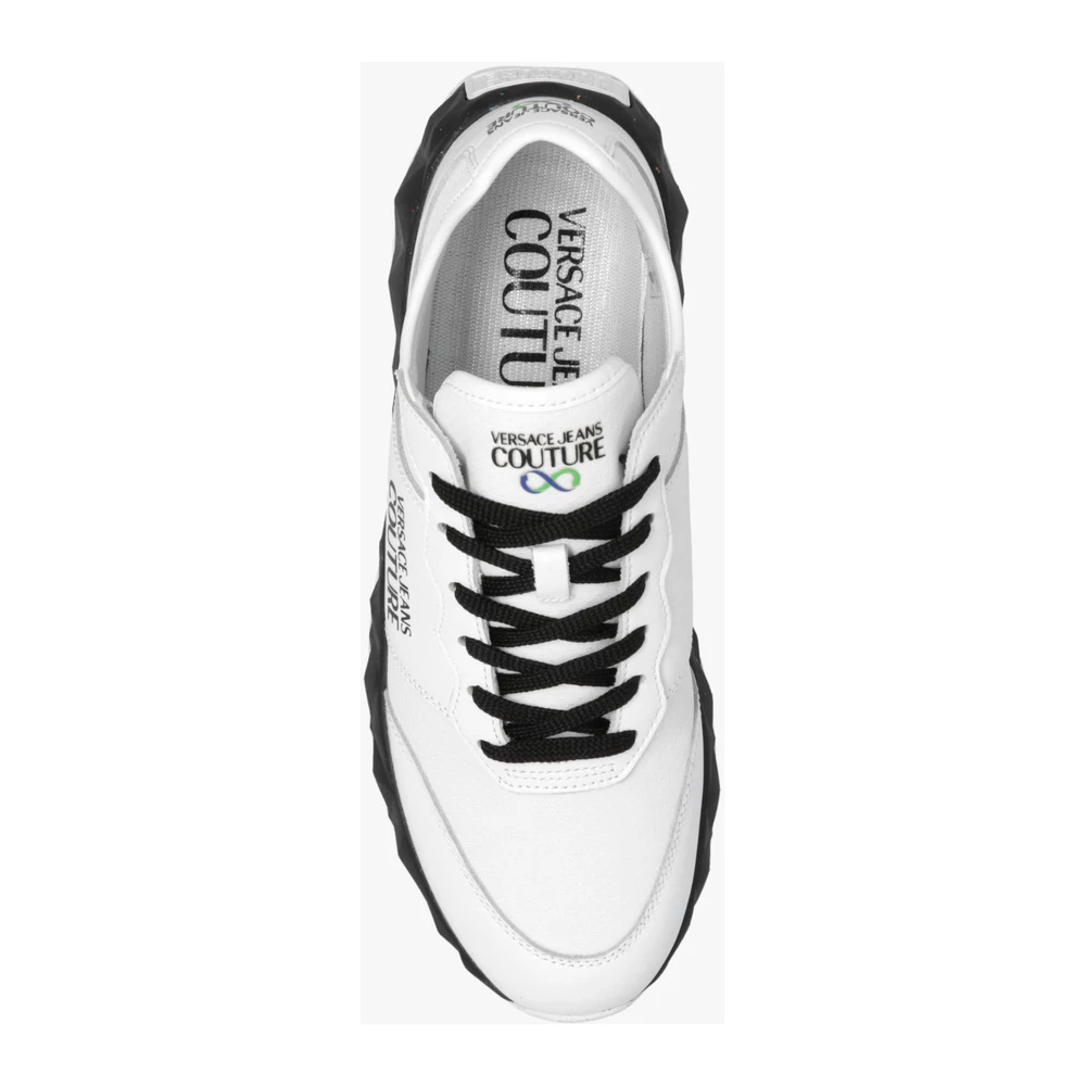 Hvite og svarte âatomâ joggesko fra Versace Jeans Couture. Denne snĂžremodellen er laget av Ăžkologisk farget skinn og resirkulert materiale, og sitter pĂ„ en svart og hvit gummisĂ„le fremhevet med et taktilt mĂžnster og viser merkevaren til merkevaren pĂ„ tungen, siden og ryggen.