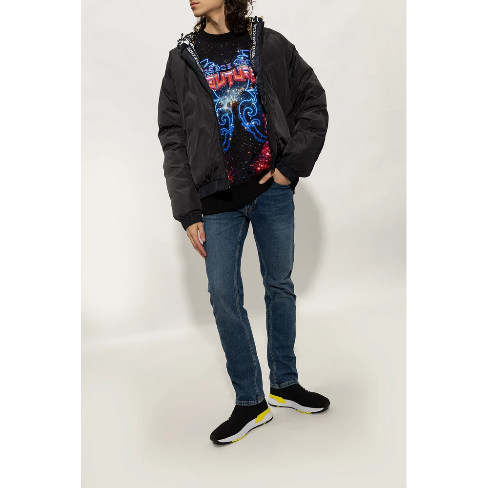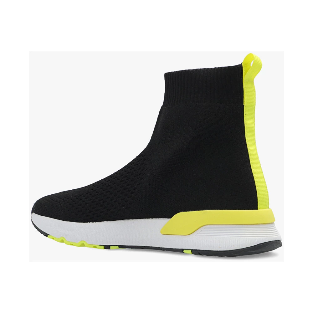 Svarte og gule slip-on joggesko fra Versace Jeans Couture. Dette paret hviler pÄ en svart og grÞnn gummisÄle, og er dekorert med et hvitt og svart logo -trykk og ribbet kant.