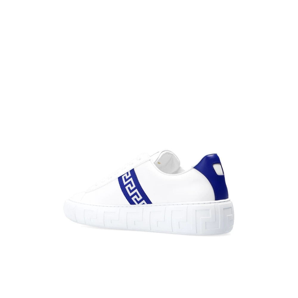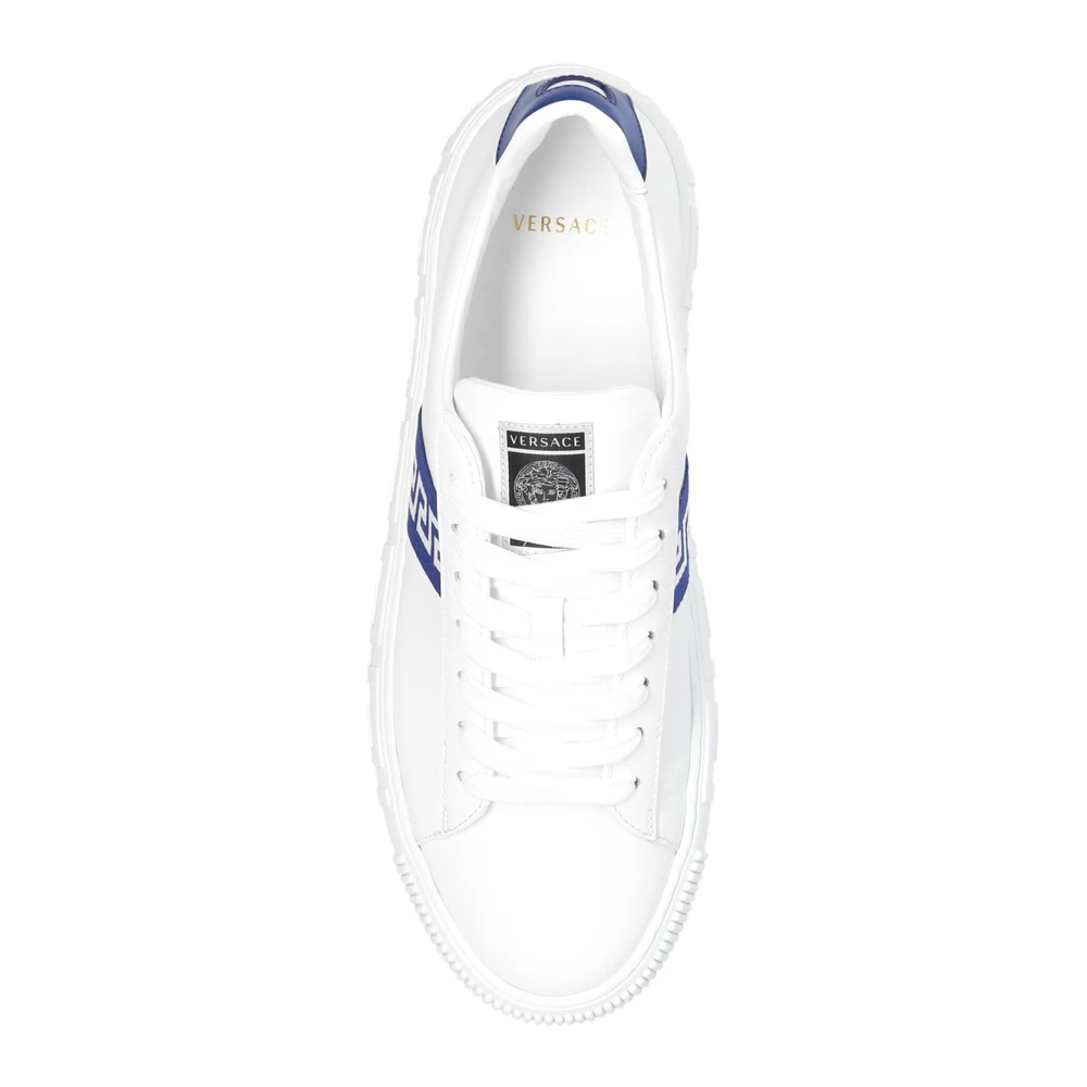 Hvite joggesko fra Versace. Dette blonderparet er laget av skinn, og sitter på en hvit gummisåle og har en merket tunge lapp og mørkeblå nettstropper på sidene.