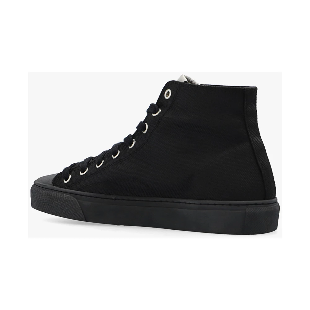 Svarte høye top joggesko fra Vivienne Westwood. Denne snøremodellen er laget av resirkulert materiale, og sitter på en svart gummisåle og har en tunge lapp og en trykt rød logo på siden.