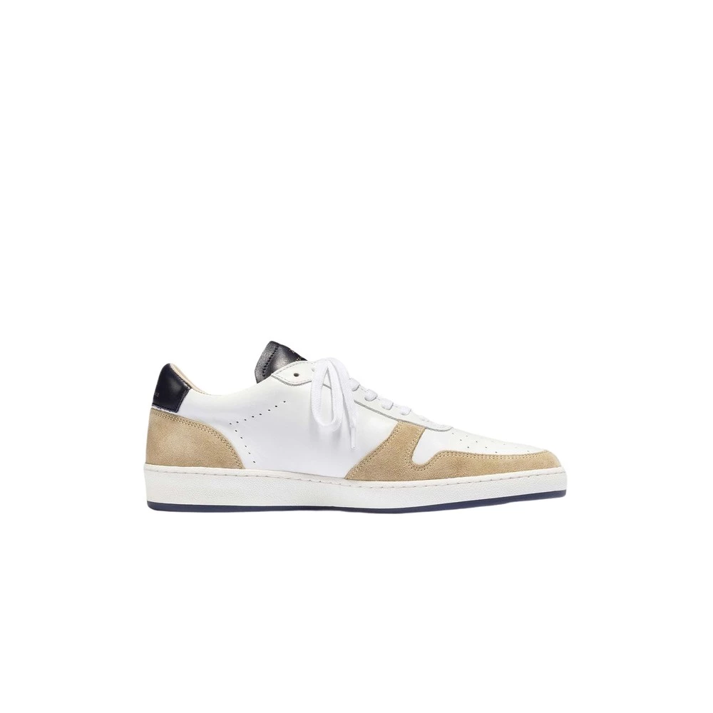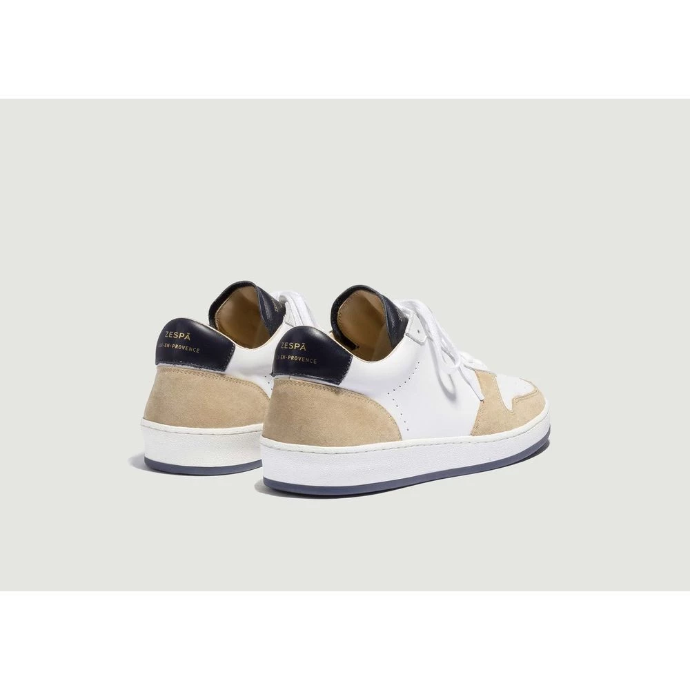 Low-Topp sneakers i hvit og marineblå italiensk full korn nappaskinn og sand-farget semsket skinn, hvit kjemmet bomull blonder under 7 maljer, perforeringer i solskinnet på forsiden, merkenavn trykket i gull på forsiden tungen og på hælen, Strobel produksjon, fullstendig korn kalveskinn foring, anatomisk innleggssåle, premium kvalitet gummisåle. Håndlaget joggesko med sidesøm.